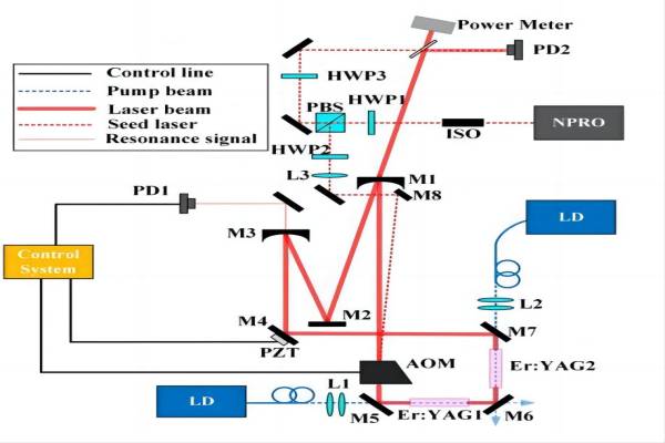 圖4.激光裝置示意圖。(PD,光電探測器;PBS,偏振分束器;HWP,半波片;ISO,隔離器;LD,激光二極管;AOM,聲光調制器;PZT,壓電陶瓷換能器。)[2]